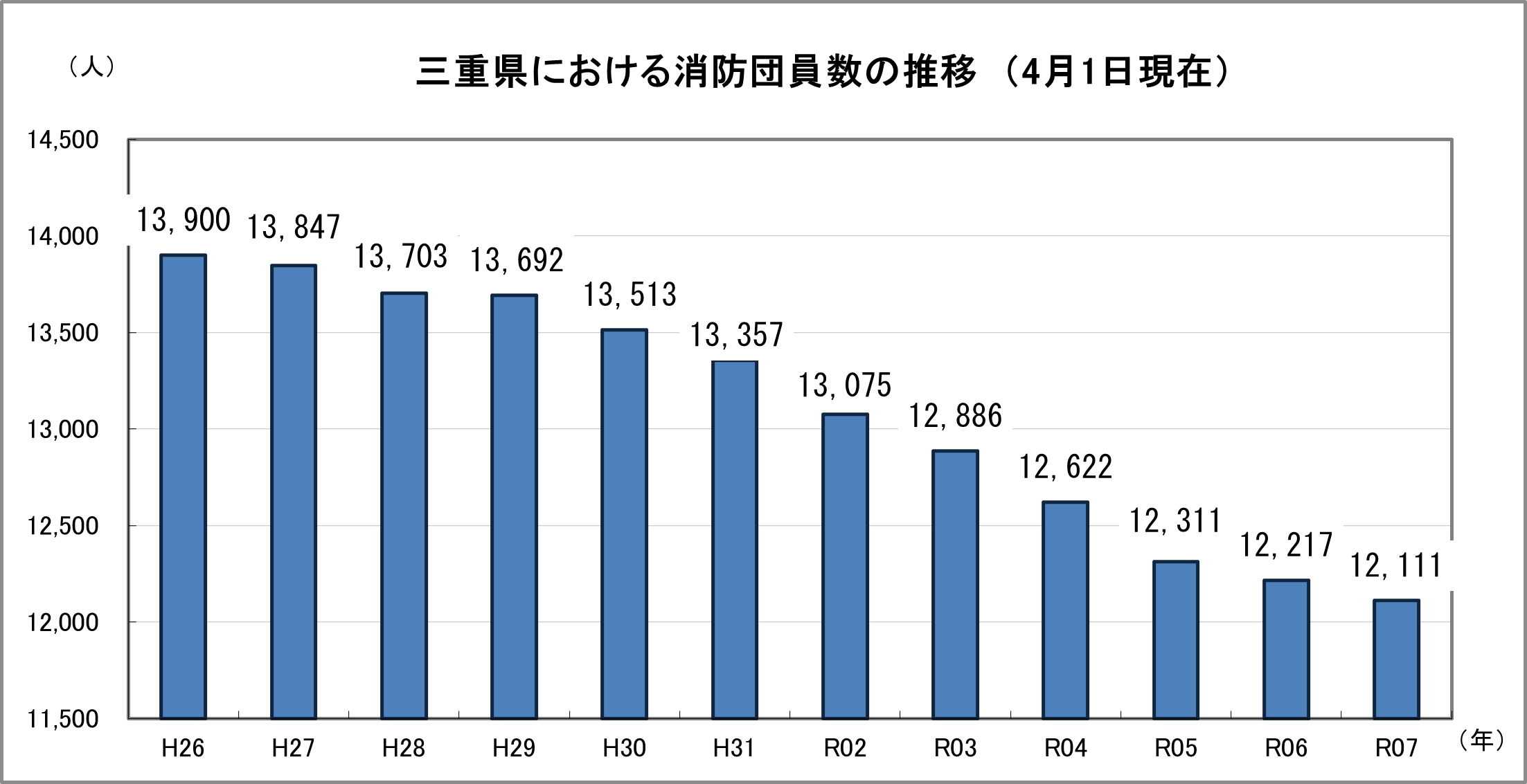 県内には29の消防団がありますが、消防団員数は、令和7年4月1日現在で12,111名となっており、毎年減少傾向にあります。