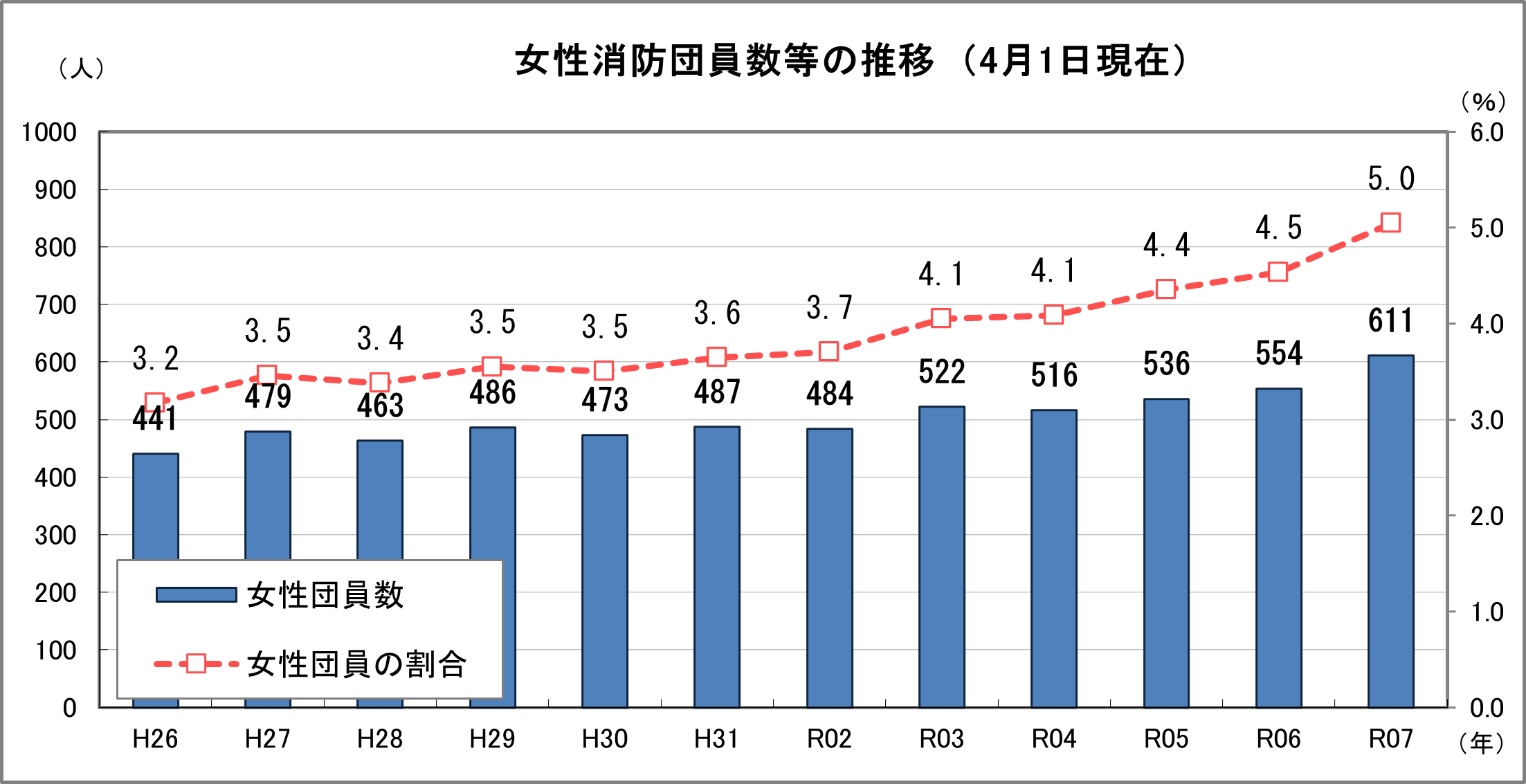 女性消防団員は、令和7年4月1日現在で、24消防団611名となっています。女性消防団員は年々増加してきており、消火活動に加え、啓発活動(防火・防災・普通救命等)や災害時の後方支援活動など幅広く活動を行っています。
