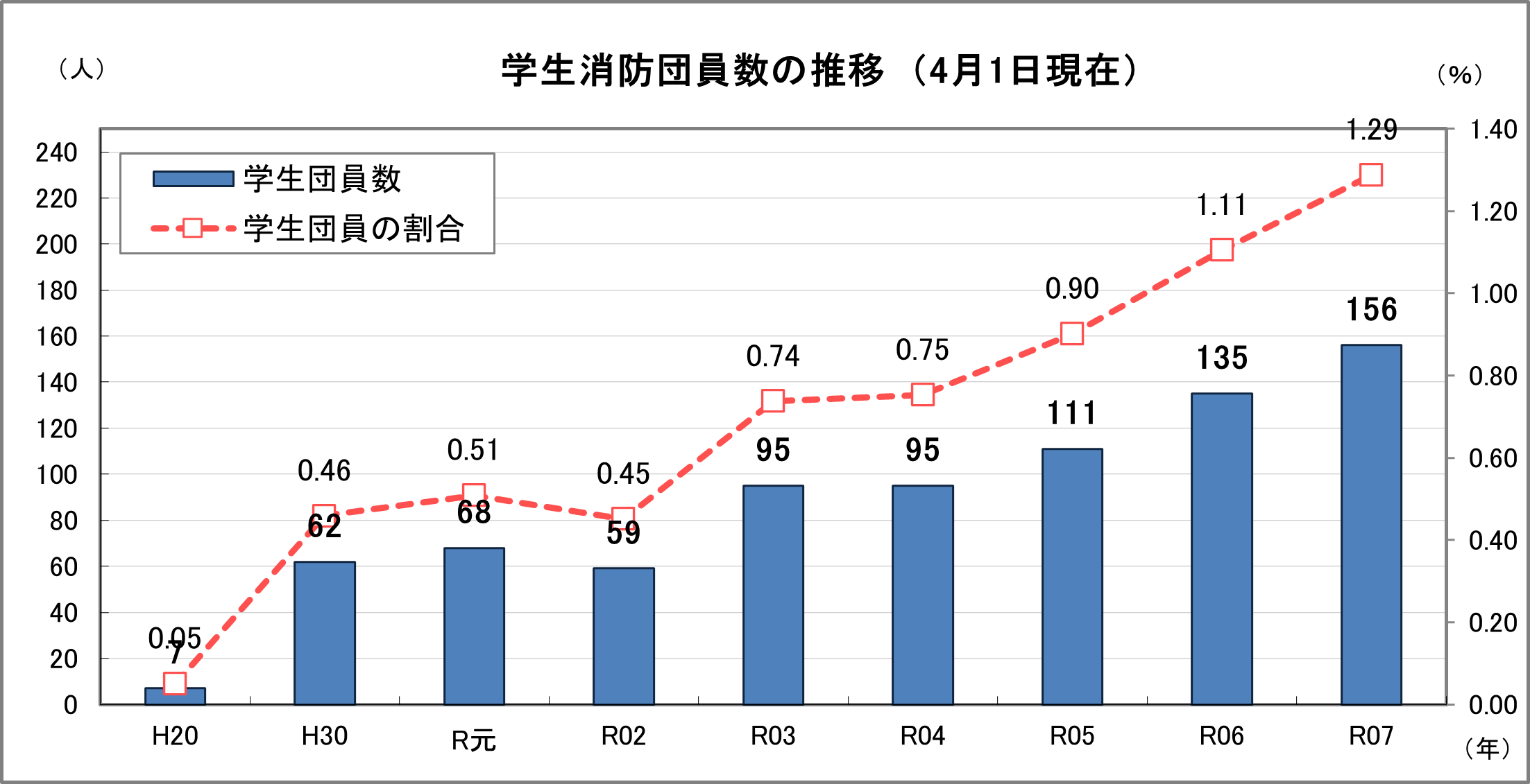 学生消防団員は、令和7年4月1日現在で、13消防団に156名が在籍しており、入学・卒業による増減があるものの、近年、学生消防団員は増加傾向にあります。学生消防団員は、啓発活動(防火・防災・普通救命等)や災害時の後方支援活動など、活動を行っています。