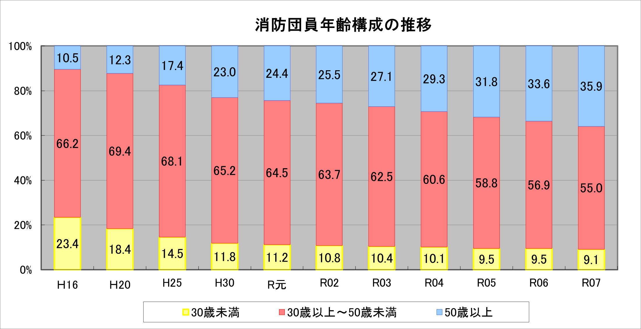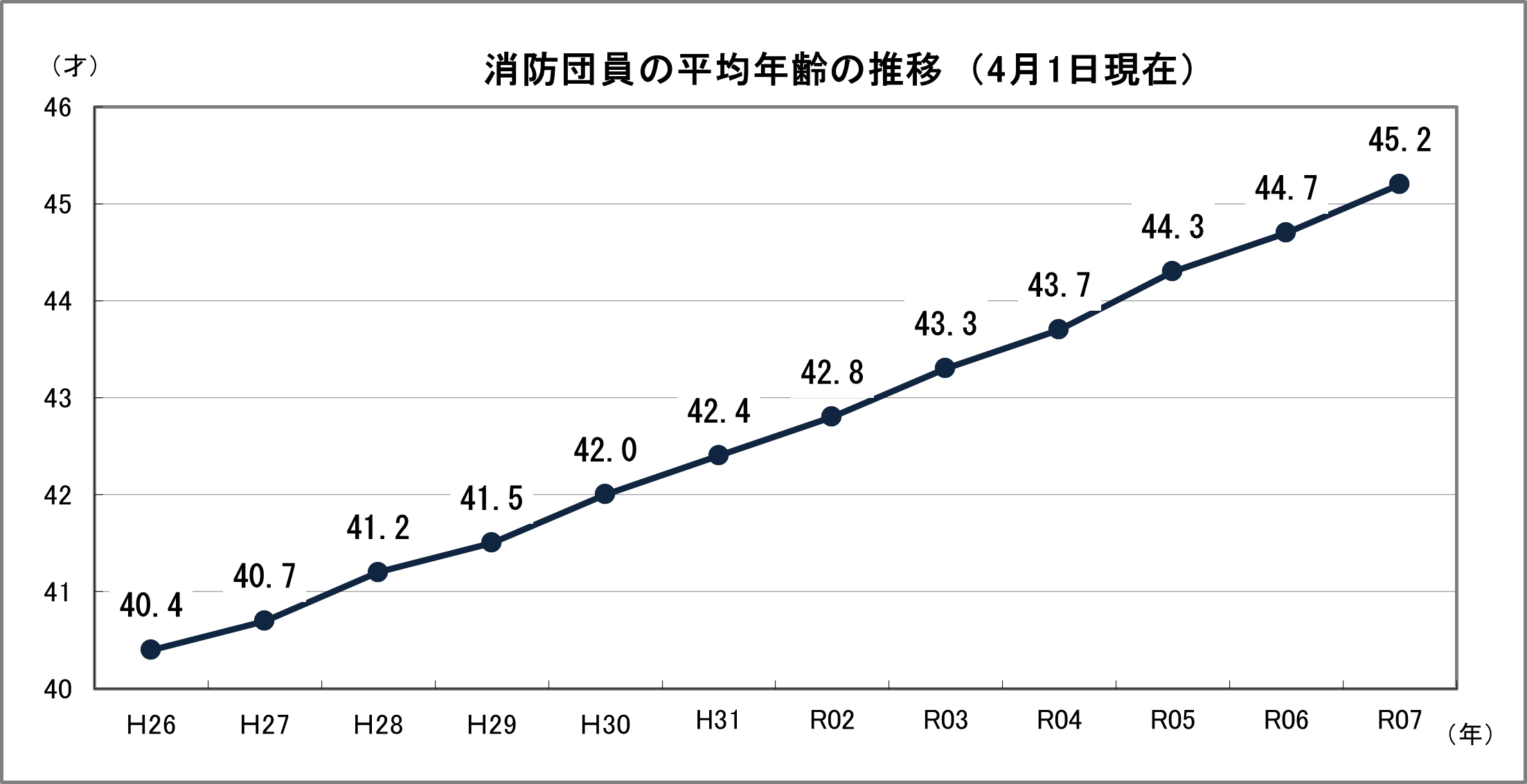 消防団員の年齢構成は高年齢化してきており、県内の消防団員の令和5年の平均年齢は、44.3歳となっています。
